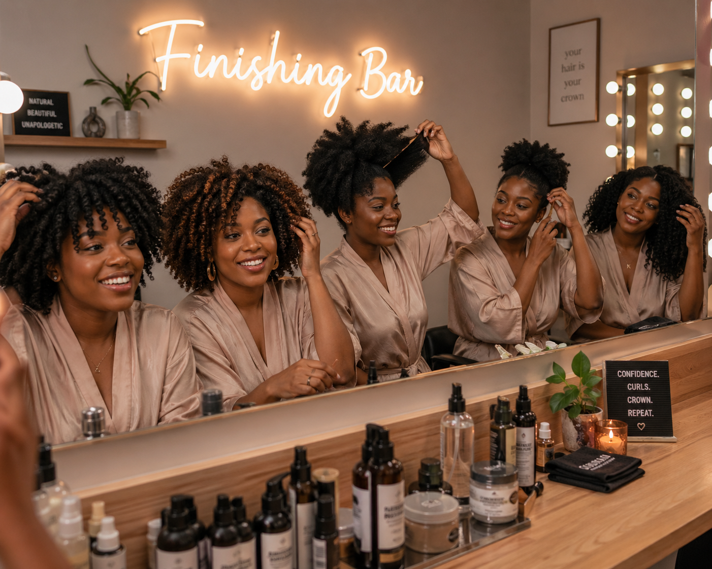 At The Finishing Bar, every detail is designed to honor your crown — from gentle stretching tools and curated textures to intentional service and cinematic care.